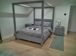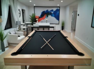 Its contemporary layout with Restoration Hardware furniture and French oak